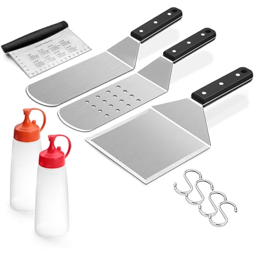 ?GREAT VALUE? This is a simple but practical griddle accessories kit with Long Spatula, Slotted Flipper, Burger Turner, Chopper Scraper, 2 Squeeze Bottles and 4 S-Hooks, They can easily satisfy most of your grilling or cooking needs, Perfect for a variety of food preparation, Such as burgers, steaks, veggies, sausages, chicken and so on, Suitable for making a barbecue, meal or breakfast