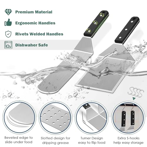 ?MUST HAVE SPATULAS? 2 Long Spatula with beveled edge to slide under food smoothly, Use them at the same time to flip food more even and cook faster, Perforated design for dripping grease, Buger Spatula with wide surface great for serving big hamburgers, chunks of meat and a whole fish, Griddle Chopper with clear scale for cutting food like dough accurately