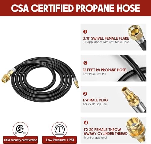 ?Great Design?The length of 12FT is suitable for most people's needs.PatioGem RV propane hose is seamlessly installed with 1/4”Male Full Flow Plug and 3/8 Female Flare Fitting and 1'' X 20Fenake Throwaway Cylinder Thread on its ends respectively. All the fittings are standardized for good compatibility and engineered from premium brass for anti-aging feature. Also, the RV propane hose with quick connect fitting is awarded CSA certification. 100% Safe!