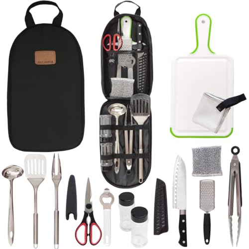 COMPACT ORGANIZER: Neatly organizes and holds your utensils in one convenient place. Each utensil has its own designated pouch, so units don’t get smeared, scratched or damaged in storage or in transit. This 13 Piece set includes: precision knife, plastic cutting board, food scissors, spatula, soup ladle, tongs, grater, steak fork, can opener, 2 salt and pepper shakers, microfiber cloth, and camping towel!