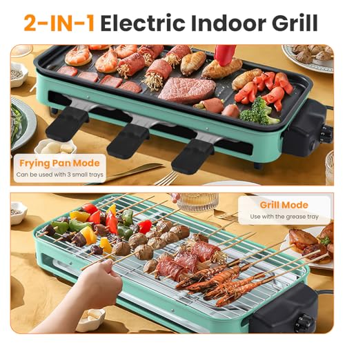 ?2-IN-1 Indoor Electric Grill?-Our electric grill comes with a baking tray and grill mesh, allowing you to cook up, fry or grill meats, veggies and seafood. Able to prepare your delectable crepes, pancakes, eggs, or achieve beautiful grill marks on your favorite meats, seafood and veggies. In addition the indoor smokeless grill comes with 3Pcs individual small trays for melting raclette cheese, cooking various side dishes, and warming sauces.
