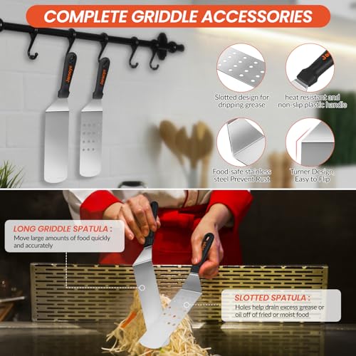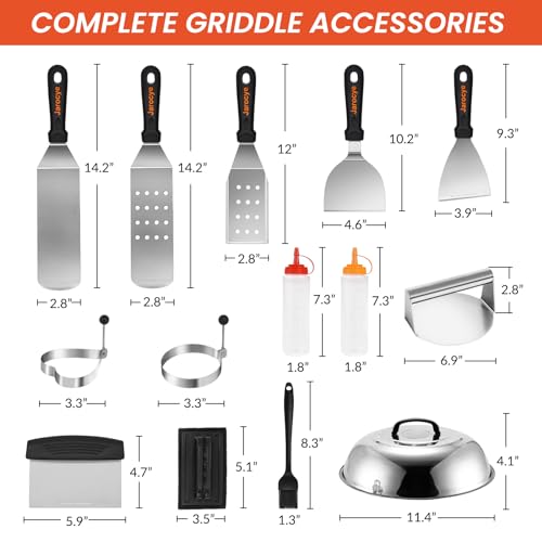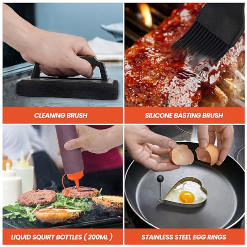 Superior Stainless Steel Construction: Crafted from high-quality stainless steel, our griddle accessories are meticulously tested to ensure they resist breakage, bending, and rusting. Built to withstand the rigors of daily barbecue and cooking, our set offers unparalleled durability, heat resistance, rust-proofing, and BPA-free safety for all your grilling, camping, and culinary adventures.