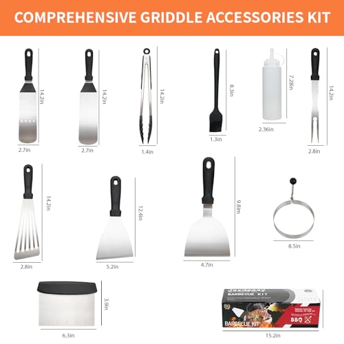 ?Perfect 15-Piece BBQ Accessories? This griddle accessories kit includes: 1 long griddle spatula, 1 long slotted spatula, 1 burger flipper, 1 slant edge scraper, 1 large burger turner, 1 griddle chopper, 1 grill fork, 1 grill tongs, 2 squeeze bottles, 2 egg rings, 1 cleaning brush, 1 sauce brush, and 1 gift box.