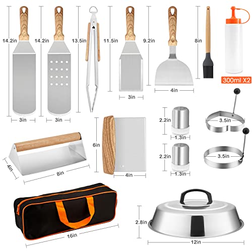 SAVE TIME & ENERGY - Sharp beveled edges for efficient turning, lifting and frying, Griddle scrapers provide a handy way to cut and scrape anytime, Melting Domes can trap heat and circular smoke inside evenly, Leak-proof squeeze bottles for holding enough condiments and liquids, Cast iron grill press can withstand a lot of force when press bacons, steaks, kabobs