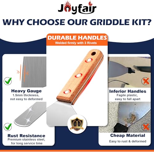 ?HEAVY DUTY? Our griddle spatulas are made of heavy gauge stainless steel, Sturdy and thicker than other brands, With solid construction, Strong enough to hold heavier food without bending, Rust-free and durable for daily use, Exquisite wooden handle can withstand high temperature for keeping cool when cooking, No burrs for safe grasp and will not get fade or crack. (NOTICE: Clean By Hand, Non-Dishwasher Safe)
