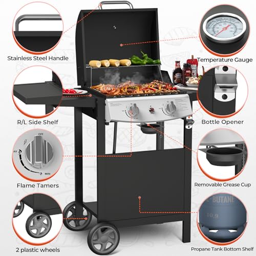 21000 BTU Propane Gas Grill with 2-Burner,325 sq.in Outdoor BBQ Grill for Barbecue Cooking with Top Cover Lid,Wheels,Side Storage Shelves,Barbeque Stove for Patio Garden Camping,Black