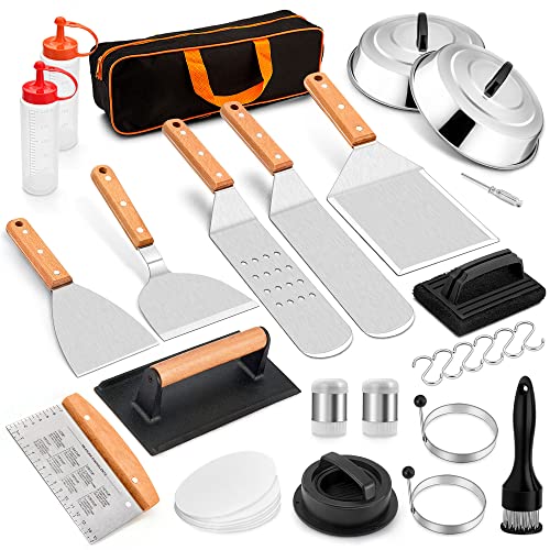 Professional 21Pcs griddle accessories kit, including 2 melting dome, 1 bacon press, 1 middle spatula, 1 slotted spatula, 1 burger spatula, 1 flipper, 1 griddle scraper, 1 hamburger patty maker, 1 meat tenderizer, 1 scraper chopper, 2 egg rings, 2 pepper grinder, 2 squeeze bottles, 1 grill brush, 30pcs patty paper, 1 carry bag, 6 S hooks