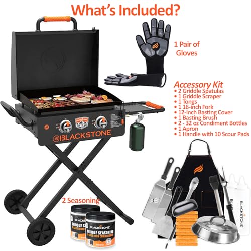 Blackstone BBQ Grill Accessories - This kit contains many accessories to help you with easy grilling, handling, and cleaning. Kit combo includes Blackstone 22 inch griddle with Flexfold legs, griddle seasoning, 2 spatulas, 1 scraper, 1 pair of tongs, a 12-inch basting cover, 2-32 oz condiment bottles, an apron, and a pair of Blackstone griddle gloves.