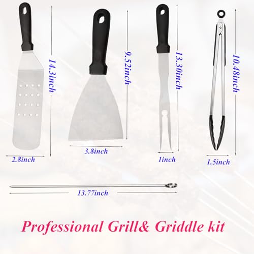 PREMIUM STAINLESS STEEL MATERIAL: Our BBQ accessories set is made of food grade stainless steel for durability. It is not easy to rust, can be used continuously, and is not easy to bend and break. Safe to put inside the dishwasher for cleaning. Silicone non-slip handle design, safe grip, heat insulation, will not be easily damaged. This grilling accessories kit is compatible with the Blackstone Grill, Camp Chef Flat Top Grill or Outdoor BBQ, Teppanyaki and Camping