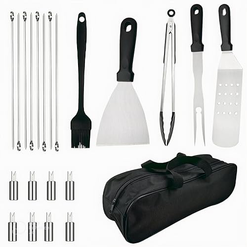 COST EFFECTIVE GRILL ACCESSORIES SET: This 22 piece BBQ set, including 1* Long Spatulas, 1* Slant Edge Scraper, 1* BBQ Fork, 1* Silicone Sauce Brush, 1* Barbecue Tongs, 8* Corn Holders, 8* Steel Skewers, 1* Storage Bag. Easy to achieve the perfect barbecue party