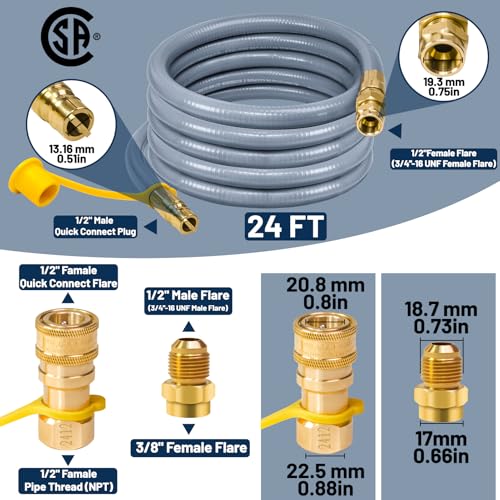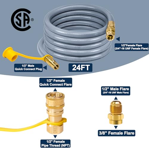 Package Include: 24ft 1/2" ID natural gas hose with 1/2" Male Quick Connect Plug x 1/2" Female Quick Connect, 1/2" Female Pipe Thread (NPT) x 1/2" Female Quick Connect Flare?1/2" Male flare x 3/8" Female Flare, 1xRoll Sealing Tape, 1xBuckle Velcro, 1x Wrench, 1xProduct Manual