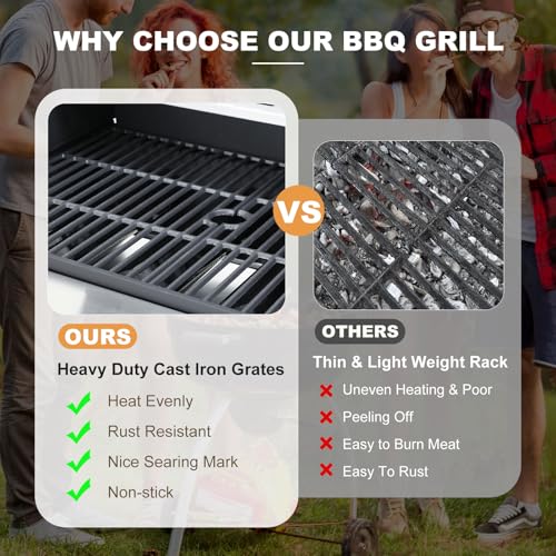 Porcelain-Enameled Cast Iron Grates: Cast Iron is built for better heat conduction when cooking, and withstand extreme heat (up to 1020°F), the durable firebox ensures long-lasting performance and reliability for all outdoor cooking needs.