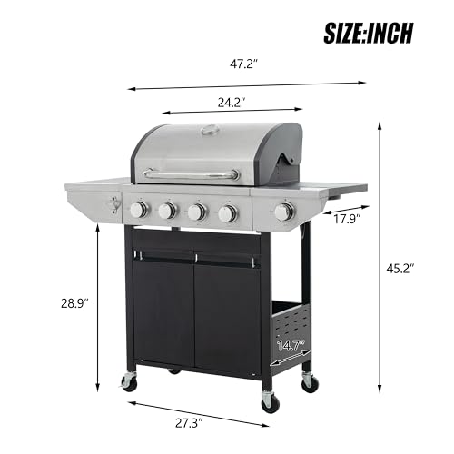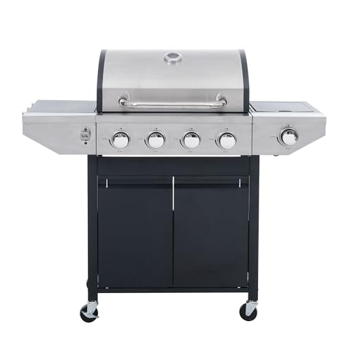 Stainless Steel Burners - 4 stianless steel burners and side burner are individually controlled by 5 swith knobs, you can adjust the flame combined with the Quick-Start battery electronic ignite system. 42,000 BTU output in total including 32,000 BTU for main cooking area and 10,000 BTU for side burner.