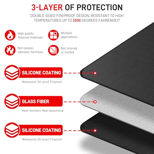 ?Premium Quality?The grill mat made of four layers of double-sided durable material fiberglass and non-itchy silicone coating, cotton. More fireproof, waterproof, oilproof, non-stick, tearing, rolling, cracking when heated, and can resist damage to decks and terraces from various high temperatures.