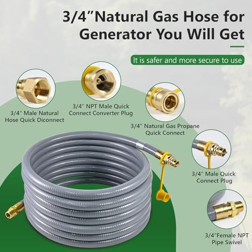 3/4" Natural Gas Hose with Quick Connect Kit:50FT 3/4" ID natural gas hose and quick connect disconnect fittings for NG/LP propane natural gas conversion kit for generator includes 50ft*1 Gas Hose, 3/4" male quick release connect plug*1,3/4" NPT female quick release connect plug*1, 3/4" female quick release connect plug*1,telflon sealing tape*1.The kits have protective plugs and covers, so you don't have to worry about collisions and damage when not in use or getting dust