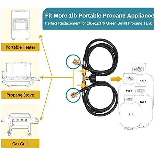 EASY & CONVENIENT: This propane two way splitter hose is a perfect replacement for the 16.4oz/1 pound green small tank, and it can be directly connected to a 1-pound portable propane device without an additional regulator.
