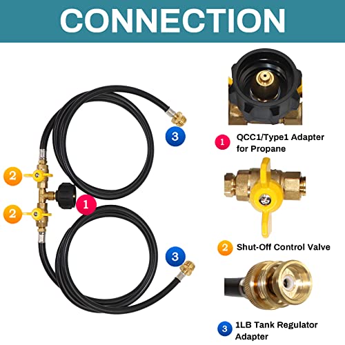 WIDELY APPLICATION: The propane 2 way Y splitter hose is compatible with all equipment with QCC1/Type 1 connection and 1 lb to 20 lb propane tank, suitable for camping stoves, tabletop grills, tailgates, outdoor heaters, coleman camping stove, weber Q grill and more 1-lb portable propane equipment.