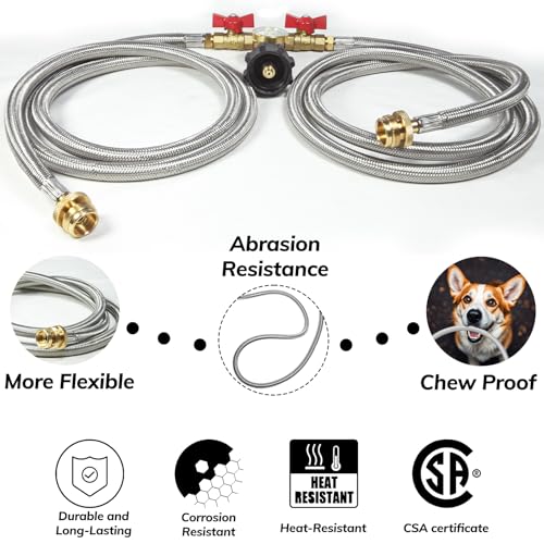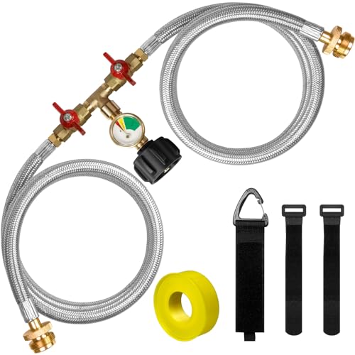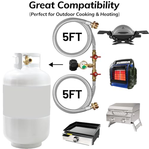 ?????Premium Material?--5Ft Propane Hose Splitter is made of durable stainless steel braided to better prevent against animal gnawing.The Gauge and all Connection Fittings are made of 100% solid brass to ensure a secure connection between the propane appliance and the propane tank.