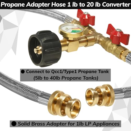 5FT Propane Hose Splitter,Stainless Braided Propane 2 Way Y Splitter Adapter Hose with Gauge,1 lb to 20 lb Converter with Shut Off Valve, Propane Hose Adapter 1lb Appliance to QCC1 5-40lb Tank,350PSI