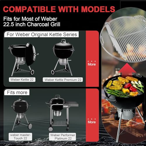 Compatibility: Hinged cooking grate for weber 22 inch charcoal grill, for weber replacement grill grates,fits for weber original kettle charcoal grill, for Original Kettle Premium Performer, Master-Touch and Bar-B-Kettle series, round charcoal grate for Weber Jumbo Joe Premium Charcoal Grill, The 22-inch grill grate for webber kettle grill accessories, parts for weber 22 inch grill accessories; ?? Please note: Doesn't fit the Weber Smokey Mountain Cooker.