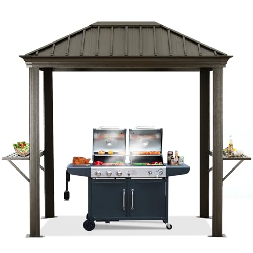 ?Spacious 6x8 Grill Gazebo: The overall dimension of our 6x8 BBQ gazebo is: 7.9'L x 5.8'W x 8.1'H, which has a larger shade area than normal gazebo, you have more space to enjoy the grilling time. And it possesses side tables that provide a place for your food and drinks, this hardtop grill gazebo is best for your barbequing!