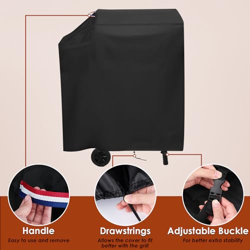 Drawstrings & Buckle & Handle: Elastic cord allows the cover to fit better with the grill. Adjustable buckle on the grill egs for better extra stability, so you don't have to worry about the impact of windy weather.The handle is convenient for your daily use