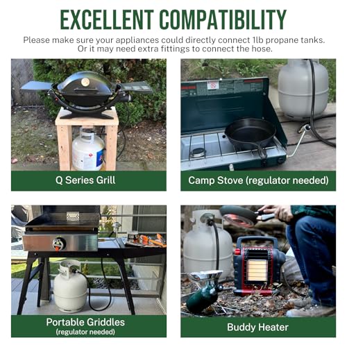 Known for Compatibility — Alloxity propane hose adapter is specifically designed to fit perfectly for Weber Q grills, Coleman camping stoves, Blackstone 17" & 22" griddles (regulator needed) and Buddy heaters. Moreover, this propane adapter hose can easily connect most 1lb. LP outdoor appliances to 5-40lb propane tanks, making it an ideal choice for camping, tailgating, heating or outdoor grilling.