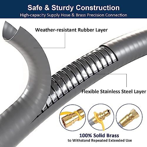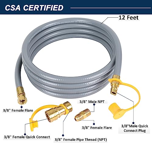 Premium Quality for Long-lasting Usage. High-capacity natural gas supply hose and brass precision connection with dust cap and plug, make sure excellent sealing quality and durability. Quick connect adapter and fittings of gas quick connect hose are constructed of brass to withstand repeated, extended use. 50, 000 BTU/hour maximum capacity. CSA certificated.
