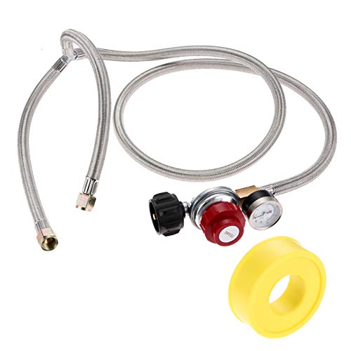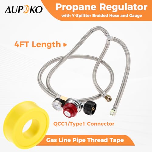 EASY TO INSTALL ---- Adjustable propane regulator Stainless Braided Hose 0-30 psi with gauge kit is easy and quick attachment for easier installation, and we also supply 1pc gas line tape, providing a highly resistant seal on pipe threads for all types of service. Inlet pressure range are 25-250PSIG, output pressure 0~30 PSI adjustable with 4FT long stainless steel braided hose, please note Non-Y braided hose length 4FT and Y spiltted part (two) each 30cm.