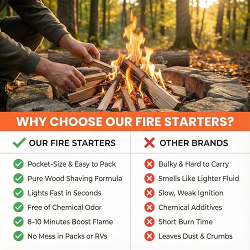 FAST, RELIABLE IGNITION: Spark warm nights fast. Each natural fire starter burns 8–10 minutes, throwing steady heat to light logs or charcoal as a charcoal fire starter. A dependable fire starter for campfire stories and cozy fireplace evenings