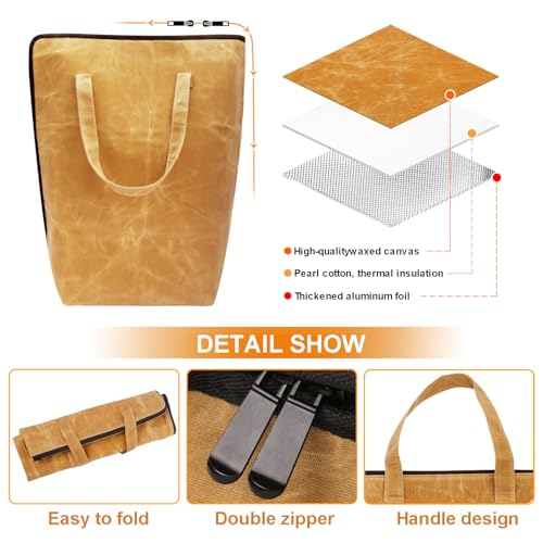 ?High-Quality Materials?Made of waterproof waxed canvas material on the surface, pearl cotton in the middle, and aluminum foil inside, which is high temperature resistant, durable and easy to clean. The foil layer keeps food warm, insulated, and moist and tasty. Whether you're out camping or packing food for home from outside, using this BBQ blanket is a great choice.