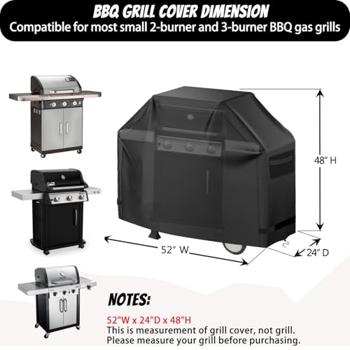 ?Grill Cover Size? 52''L x 24''W x 48''H, fits most 3-burner or 4-burner grills up to 52'' wide. BBQ Grill cover selection will depend on the size of your grill, please measure your grill before purchasing to ensure the proper fit.