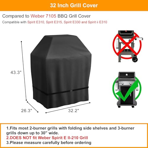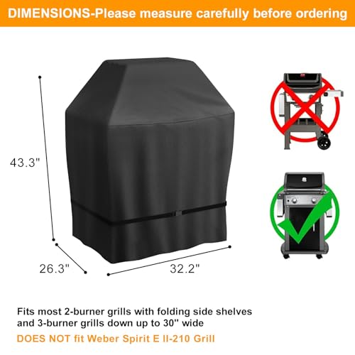 Wide Compatibility - Porudct size : L x W x H - 32.2 X 26.3 X 43.3 Inch, Fits most 2-burner grills with folding side shelves and 3-burner grills down up to 30" wide. DOES NOT fit Weber Spirit E ll-210 Grill, Please measure your grill twice before ordering and choose the best one for your grill from our wide range of sizes