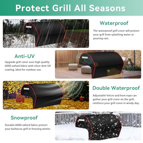 ?Upgraded Material?: The Grill Cover is made of heavy duty Oxford fabric with waterproof PVC coating that can last through all seasons. This new upgraded material that is extremely Sturdy and Heavy-Duty, rip resistant, water repellent that can last through all seasons - it has the function of waterproof in rain and dustproof and anti-UV in sunny day. No matter what the weather, it can prevent strong wind, rain, storm, intense sunshine, dust, snow, etc.