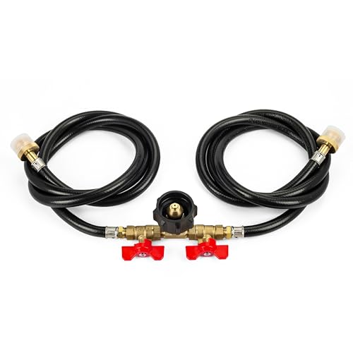Easy To Install: The two-way design allows you to connect two appliances to one propane tank at the same time, NO NEED for two hoses, two adapters, or two propane tanks. It can be easily taken anywhere to connect your appliances and tanks, making it an ideal choice for camping, tailgating, heating, or outdoor grilling. Please make sure the connectors are firmly tightened to ensure safety.