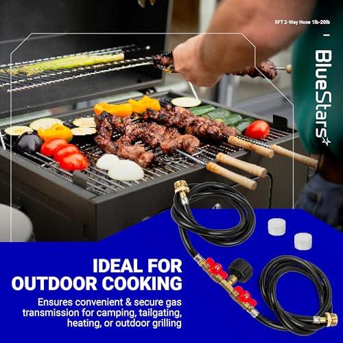 Superior Quality: BlueStars 5FT 2-Way Propane Hose is well-designed with 3 material layers: 1-Protective weather-resistant PVC, 2-High-tensile Cotton braiding, 3-Sturdy PVC. It also features solid & rustless brass connectors. This construction offers leakproof gas transmission and 150% hose durability and resistance to corrosion from harsh weather conditions and outdoor cooking environments like heat, oil, dust,...