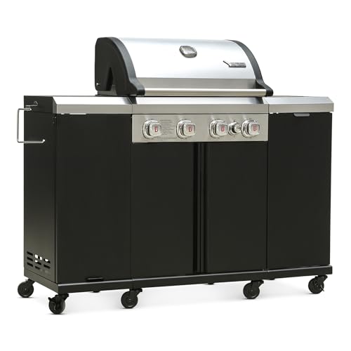 ?Powerful Gas Grill with Side Burner?4 stainless steel burners (8,000 BTU each) and a 12,000 BTU side burner deliver 44,000 BTU of even heat for versatile outdoor cooking—perfect for your outdoor kitchen grill setup