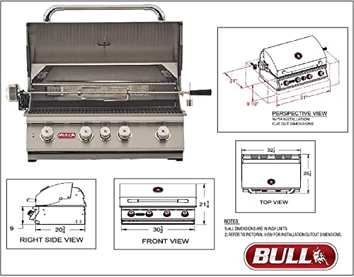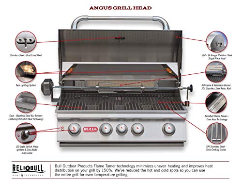 ?????Angus Grill?: -The Bull Angus 30 inch stainless steel Drop-In Grill 75,000 BTUs -304, 14 Gauge Stainless Steel Construction -Four cast stainless burners 15,000 BTUs each -Infrared back burner 15,000 BTUs -Single Piece Dual Lined Hood -Piezo igniters/Zinc Knobs -Solid Stainless Steel Grates -Heavy Duty Thermometer -Warming Rack 210 Sq. In. -SS Rotisserie Motor -Twin Lighting System -Cooking Surface 810 Sq. In. -CSA Approved