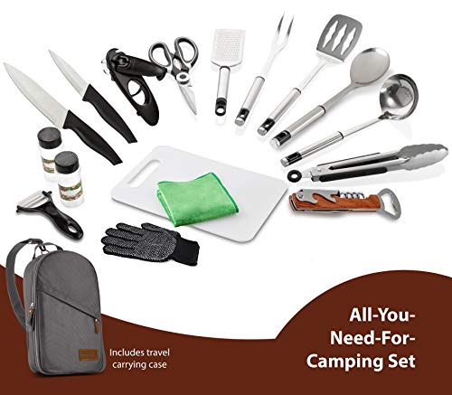 MULTIPURPOSE: The trendy kit can be used for multiple applications, perfect for concerts, sporting events, hiking, boat rides, mountaineering and BBQ’s. The weather retardant the travel utensil kit is the perfect camp kitchen accessory, and it holds all your essential outdoor cooking utensils.