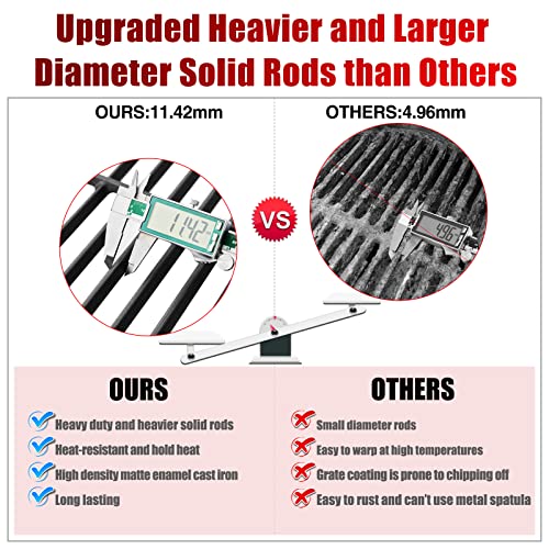 ?UPGRADED MORE HEAVIER, SMALLER CLEARANCE AND LARGER DIAMETER SOLID RODS? You will get the brinkmann grill replacement parts grill grates that are made of matte enamel cast iron. Brinkmann grill parts will last for many years if it's taken care of.?HIGH HEAT RETENTION AND COOK FOOD FAST, DELIVERS EVEN HEAT DISTRIBUTION? Heavy duty and more durable than others. perfect for searing and locking. Not like the porcelain coating grate that the coating chips or cracks over time.