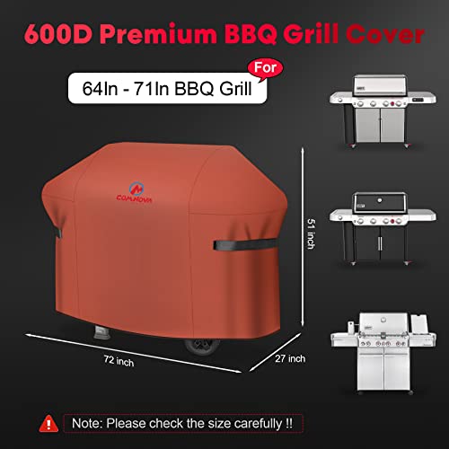 | 72 Inch Grill Cover Fit Map | - Measures: 72" width x 27" depth x 51" height, Comnova 72 inch grill covers are perfectly compatible with most 6 burners grills with widths between 64" to 71", such as Weber Genesis 400, Genesis 600 and Summit 400 series grill. Also fit most grills of Char-Broil, Nexgrill, Monument, Dyna-glo, Brinkmann and more. Please check the dimension of your grill carefully before ordering.