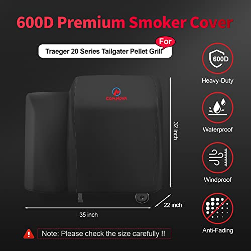 | Smoker Cover for Traeger 20 Series | - Measures: 35" width x 22" depth x 32" height, Comnova 35 inch grill covers are perfectly compatible with Traeger 20 series, Traeger Tailgater, Traeger Junior Elite and Bronson wood pellet grills. Also fit Recteq bullseye grill, Recteq RT-340 grill and other pellet grills with similar size. Please check the dimension of your smoker grills carefully before ordering.