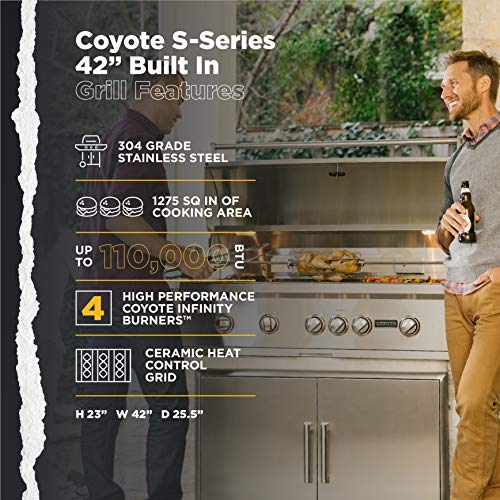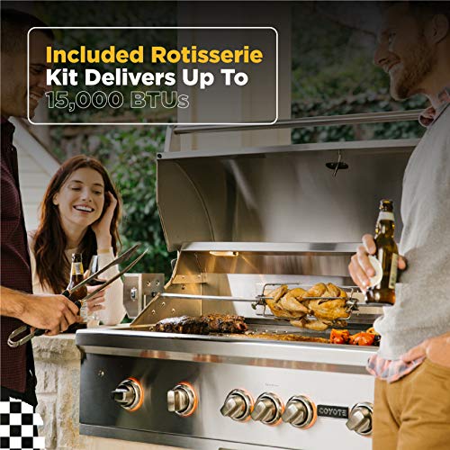 POWERED BY 4 HIGH PERFORMANCE COYOTE INFINITY BURNERS, 1 COYOTE RAPIDSEAR INFRARED BURNER, & 1 INFRARED REAR BURNER:: Delivers up to 110,000 BTUs of cooking power; Plus, the infrared rear rotisserie burner delivers up to 15,000 BTU to create succulent, slow-roasted meals