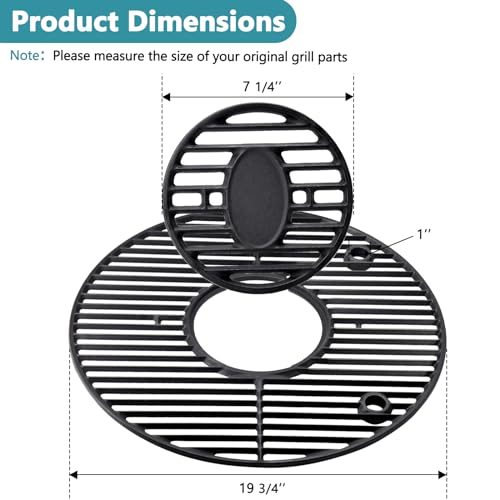 ?Dimension?- Total Cooking Grate is 19-3/4" in Diameter, Removable Center Grill Insert is 7-1/4" in Diameter. ?Material?- Heavy Duty Cast Iron. ?Package?- 1Pcs Cooking Grate for Char Griller Akorn Kamado . ? The Chargriller Akorn Grates are aftermarket replacement part, kindly compare with the SIZE and MODEL of your original parts before purchasing.