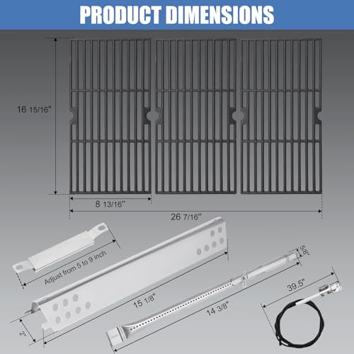 ? The 463344015 Charbroil Parts Specification - Cast Iron Grate Dimension: 16-15/16" x 8-13/16" for each, 16-15/16" x 26-7/16" for 3Pcs Grate Total; Stainless Steel Heat Plates: 15 1/8" x 2", Original part number: G458-0018-W1; ? Stainless Steel Burner Tubes: 14 3/8" x 5/8", Original part number: G432-8M00-W1; ? Adjustable Crossover tubes: Adjust from 5 to 9 inch, Original part number: G432-001D-W1. ? Length of the grill igniters wire: 100cm/39.4inch