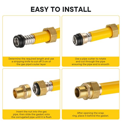 Easy Installation - The corrugated stainless steel tube is flexible and can be cut to any length, making it easy to navigate through attics, basements, corners, and bends. Its seamless construction reduces connection points and prevents gas leaks, ensuring convenience and 100% safety.Enjoy the convenience of easy installation with our flexible gas line. The corrosion-resistant stainless steel and UV-resistant sheath make it durable, while the flexible design allows for effortless routing through any space.