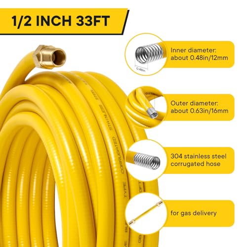 CSST Gas Line, 33 Ft 1/2" Natural Gas Hose Flexible, 1/2 Inch Corrugated Stainless Steel Tubing Hose, Propane Hose Conversion Kit Grill Hose with 2 Male Adapter Fittings