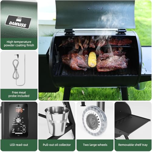 Ideal for Family Cooking: With 456 square inches of grilling space and a 15-pound hopper capacity, this grill easily accommodates up to 12 burgers, 4 racks of ribs, or 2 whole chickens. A meat probe is included to help you achieve perfectly cooked meats every time