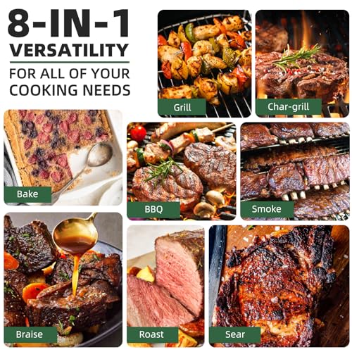 Versatile Pellet Grill: Experience 8-in-1 functionality with our pellet-fueled grill, designed for grilling, smoking, baking, roasting, braising, searing, char-grilling, and BBQ—all with a single unit