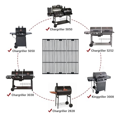 Cast Iron Grill Grates Fits: Chargriller Models: 2121, 2123, 2222, 2828, 3001, 3008, 3030, 3072, 3232, 3725, 4000, 4001, 4008, 4208, 5050, 5072, 5252, 5650, 9020 gas grill.